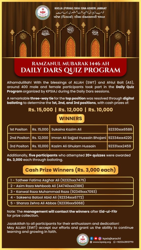 The quiz on Ramazan ul Mubarak 1446AH lectures organized by KPSIAJ attracted around 400 participants, with 53 attempting all 26 days’ questions and over 121 attempting at least 20 days’ questions. The winner answered all questions correct for 26 days, showcasing the dedication to learning. The initiative was successful in promoting learning, enhancing knowledge, and building community among participants from diverse backgrounds.
