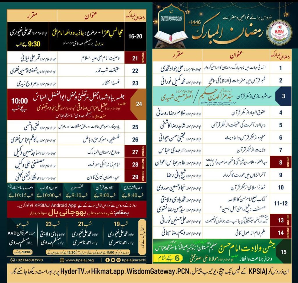Alhamdolillah, like previous years KPSIAJ is conducting series of thought provoking seminars and talkshows starting from 1st March 2025 (1st Ramazan ul Mubarak 1446) to 29th March 2025 (29th Ramazan 1446). In nights of 19th, 21st, 23rd, 27th Ramazan and in the night of Eid-ul-Fitr Aamal will be conducted. These programs will be telecasted live on our Facebook page, Youtube channel as well as on PCN, WisdomGateway, HyderTV and Hikmat.app.